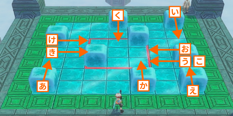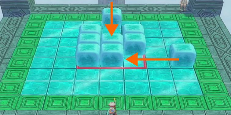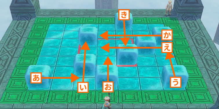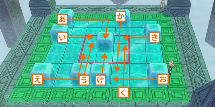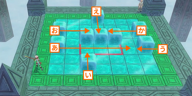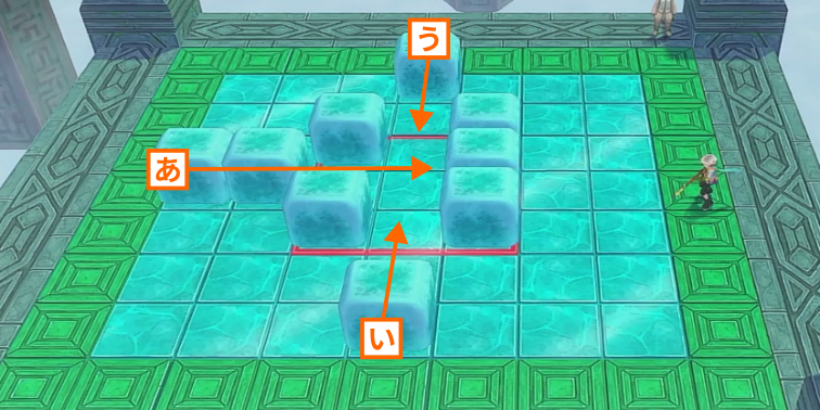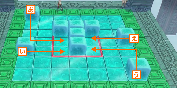 氷の床の上に配置されたキューブを滑らせて、中央にある赤い枠線の中に全て収めるとステージクリアとなります。キューブは青い枠線の箇所から内側に向かって押すことができ、斜め方向への移動はできません。