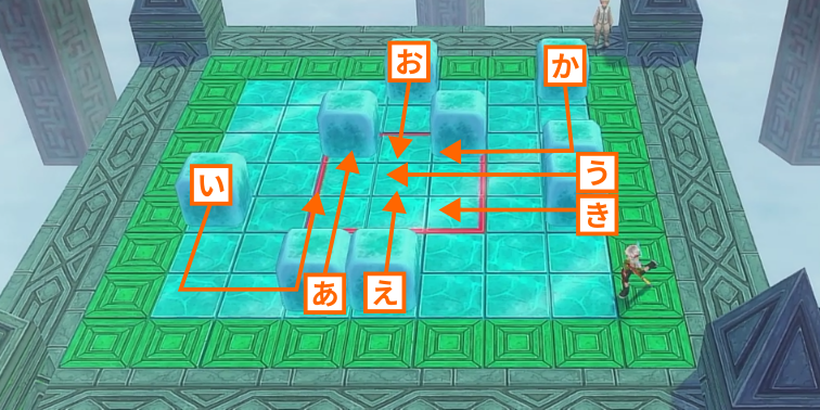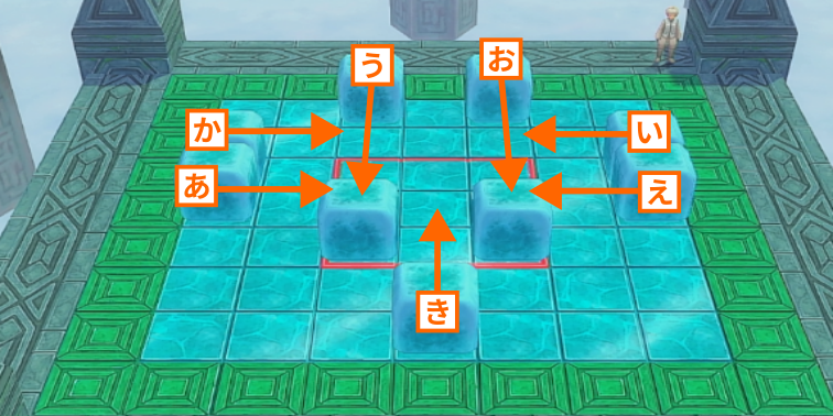 後半の操作では、盤面の各所に散らばったブロックを効率よく中央へ集める必要があります。手数が多くなる分、一つのミスが命取りになるため、下記の手順を参考に、正確に方向キーを入力してください。