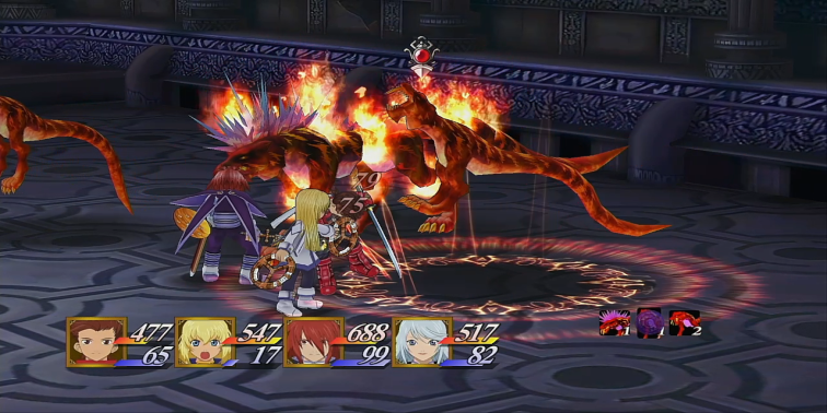 マーテル教会聖堂では、まず入口でボス「ヴィーダル」と戦いましょう。戦闘の途中でクラトスが参加し、撃破後には回復術「ファーストエイド」を使えるクラトスが正式にパーティーに加入します。