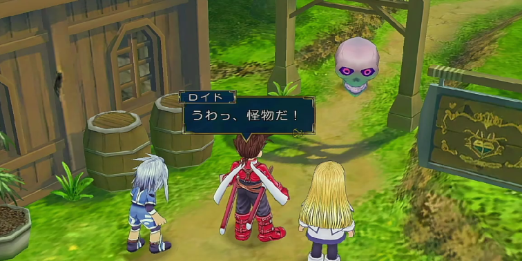 『テイルズオブシンフォニア』の冒険は、イセリアの村にある教室からスタートします。オープニングイベントが終わったら、操作可能になった主人公のロイドで教室を出ましょう。するとイベントが発生し、ジーニアスコレットがパーティーに加わります。