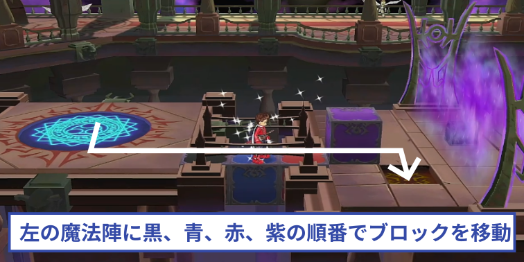 • ギミックの解き方: エリア1の左の魔法陣から「黒→青→赤→紫」の順でブロックをエリア18の右手前の溝へ運びます。